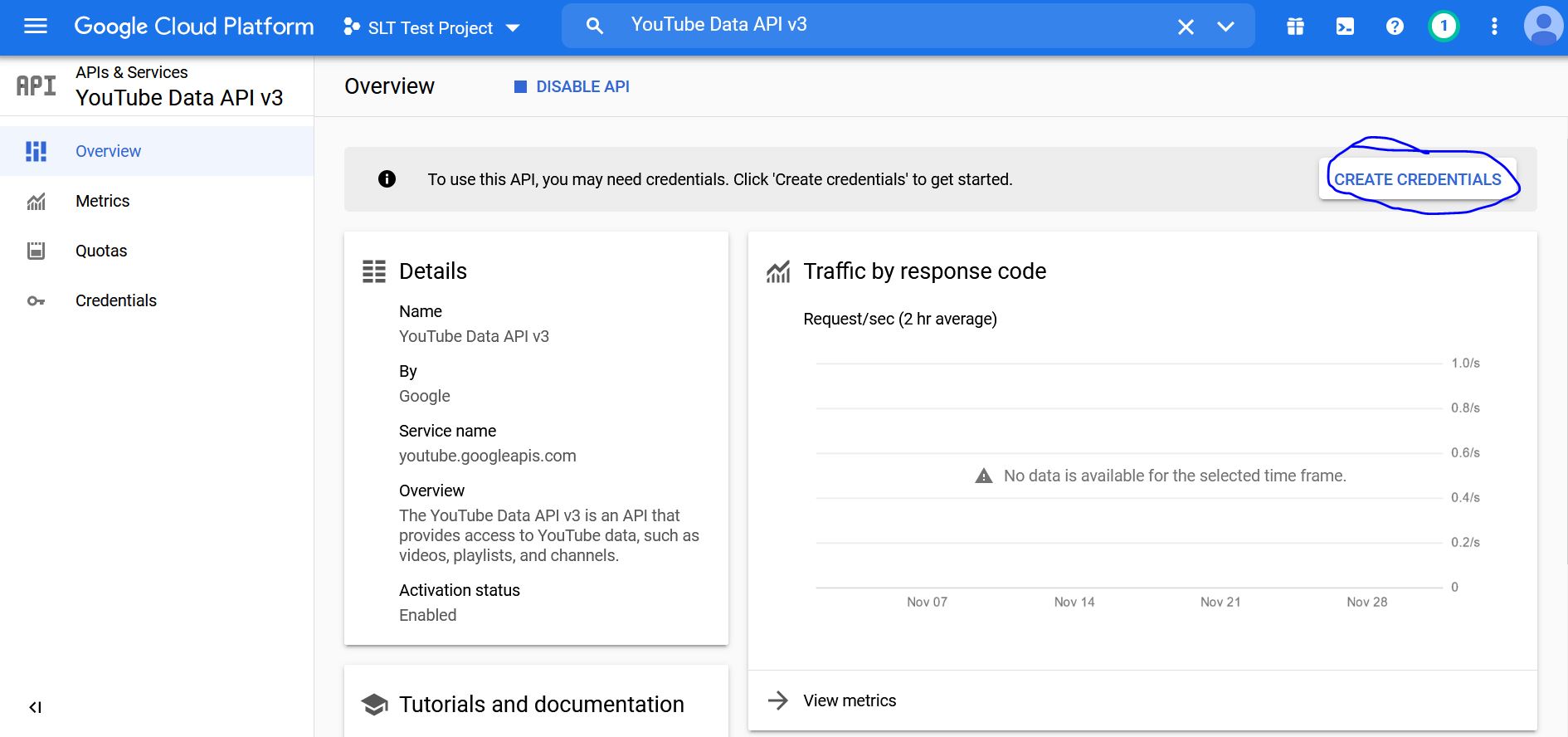 - Click on the “Enable” button, then on “Create Credentials”:
