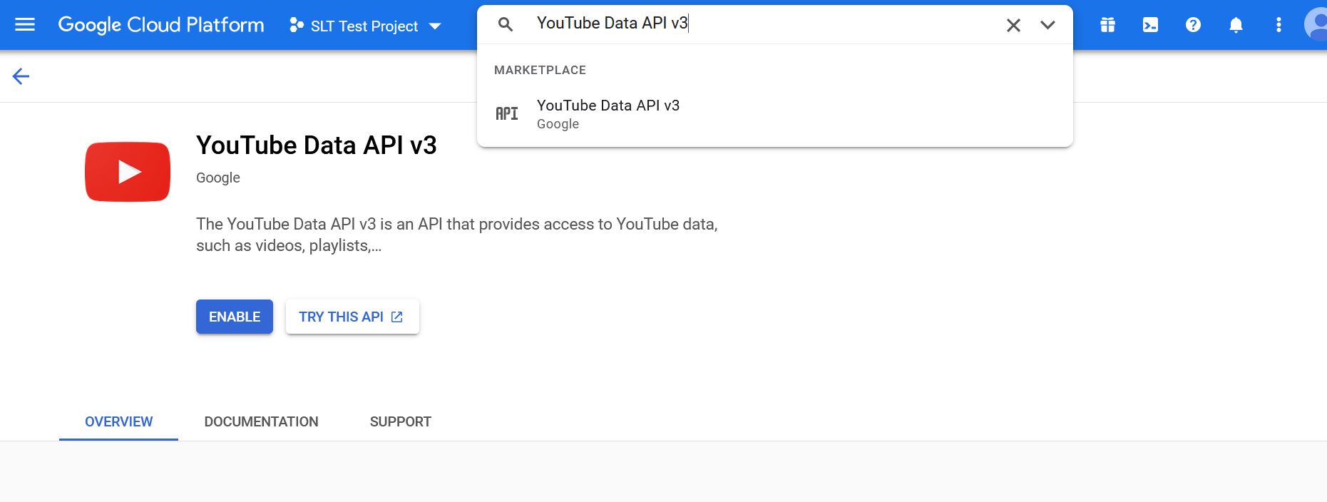 - Once you create your project, find the YouTube V3 Data API in the search or click this link. (You can also find it via the sidebar at APIs & Services > Library).